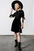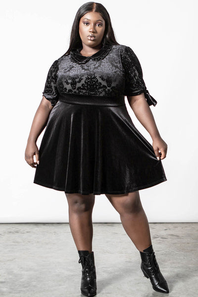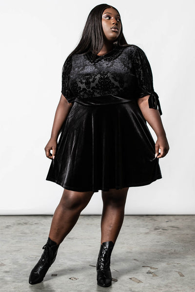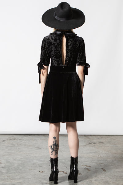 I don't live in darkness, darkness lives in me. Look like a dream-come-true in our 'Miss Furfur' dress; conjured of luxe velvet skirt and contrasting burnout velvet top, finished with custom-made pattern, which stretches to perfection for a flawless fit. Features a collar and puff sleeves with bow details. Super-versatile and easy to style - perfect from dusk to dawn!