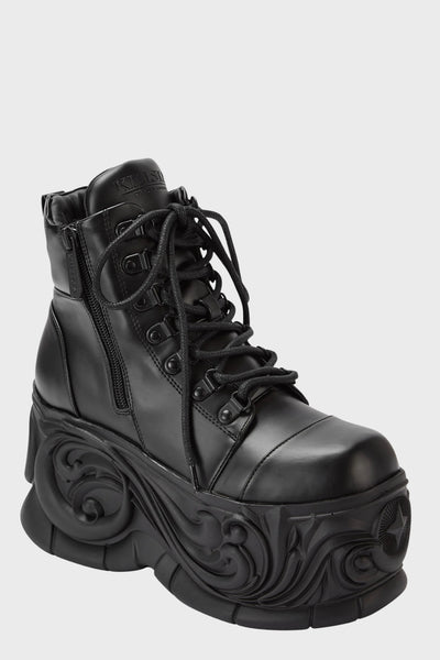 Street smart with just the right amount of twist; 'Cosmic Souls' ankle boots will tick all your boxes - all black luxe faux leather, lace-up front, high top style, and statement platform to elevate your game.