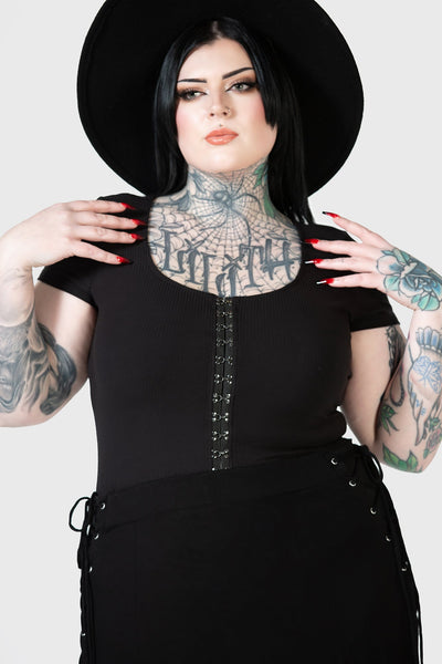 Our not-so-basic basics, featuring the 'Eye C U' top - made from our soft-stretch jersey for a comfortable and flattering fit. With a large round neck, cap sleeves and statement hook+eye feature down the front. Versatile and easy to style for your daily adventures! Hell yeah!