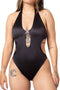 - Halter neck with metal bikini clasp closure.