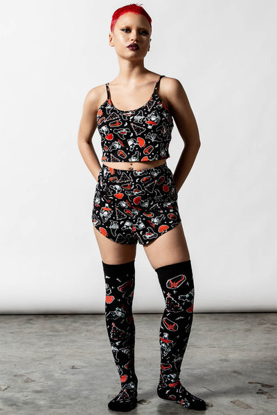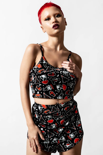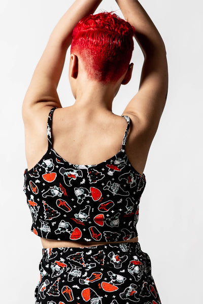Lounging in yer coffin watchin' Netflix is the life! The 'Gnomies' cropped cami is perfect for lazy days, sleep-overs, naps and movie marathons. Made in a stretchy soft fabric for perfect comfort and fit, featuring a contrast print all over and thin shoulder straps and cropped style.