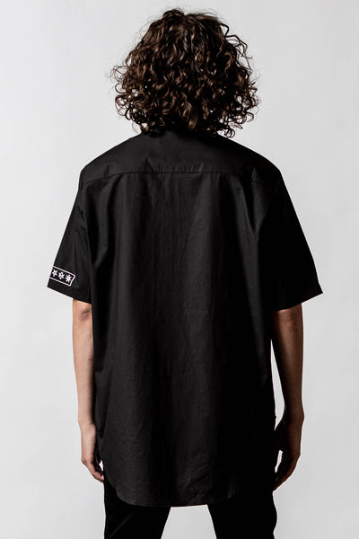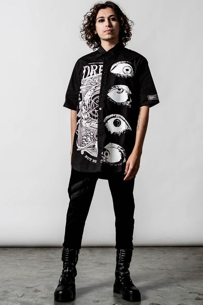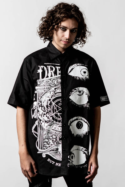 Channel some serious vibes in our 'Insomnia' longline shirt, with fitted lines to keep it smart with some killer details. In a soft fabric with collar, statement print on chest and sleeve, and some extra length.