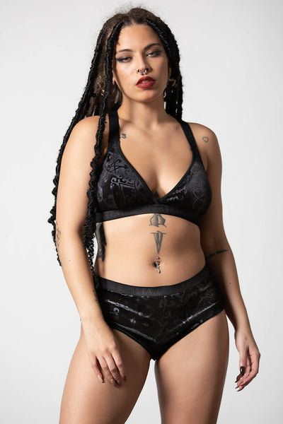 Designed with movement in mind, get in the zone in our ‘Moody’ panty. Crafted in our super strong, stretch fabric with a black-on-black statement print you’ll have the power to possess. A perfect staple for your active witch wardrobe!