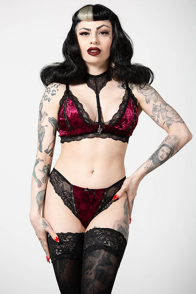 Possess all of the powers in our ‘Pin Stuck’ bra. Crafted in soft, velvet fabric with lace trim and a detachable lace collar it’s finished with metal rivet details and a metal snake charm. Perfect for seducing the demons or making yourself feel fierce.