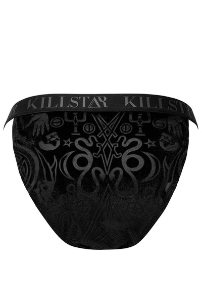 Make your dark soul purr, the 'Wicked B*tch' panty evokes your romantic side with super-soft embossed velvet, statement graphics, and strap with branding. Perfection with just the right touch of feminine energy.
